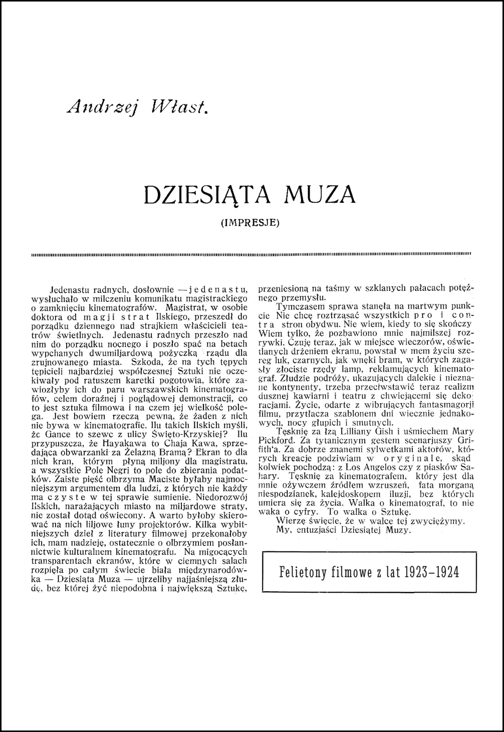 Dziesiąta Muza (impresje). Felietony filmowe z lat 1923–1924, wstęp i opracowanie naukowe Wojciech Świdziński, Biblioteka Kwartalnika Filmowego, Warszawa 2017, ISBN 978-83-65630-38-4